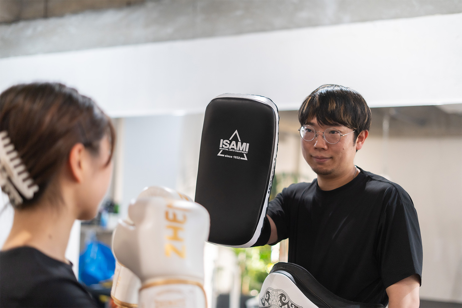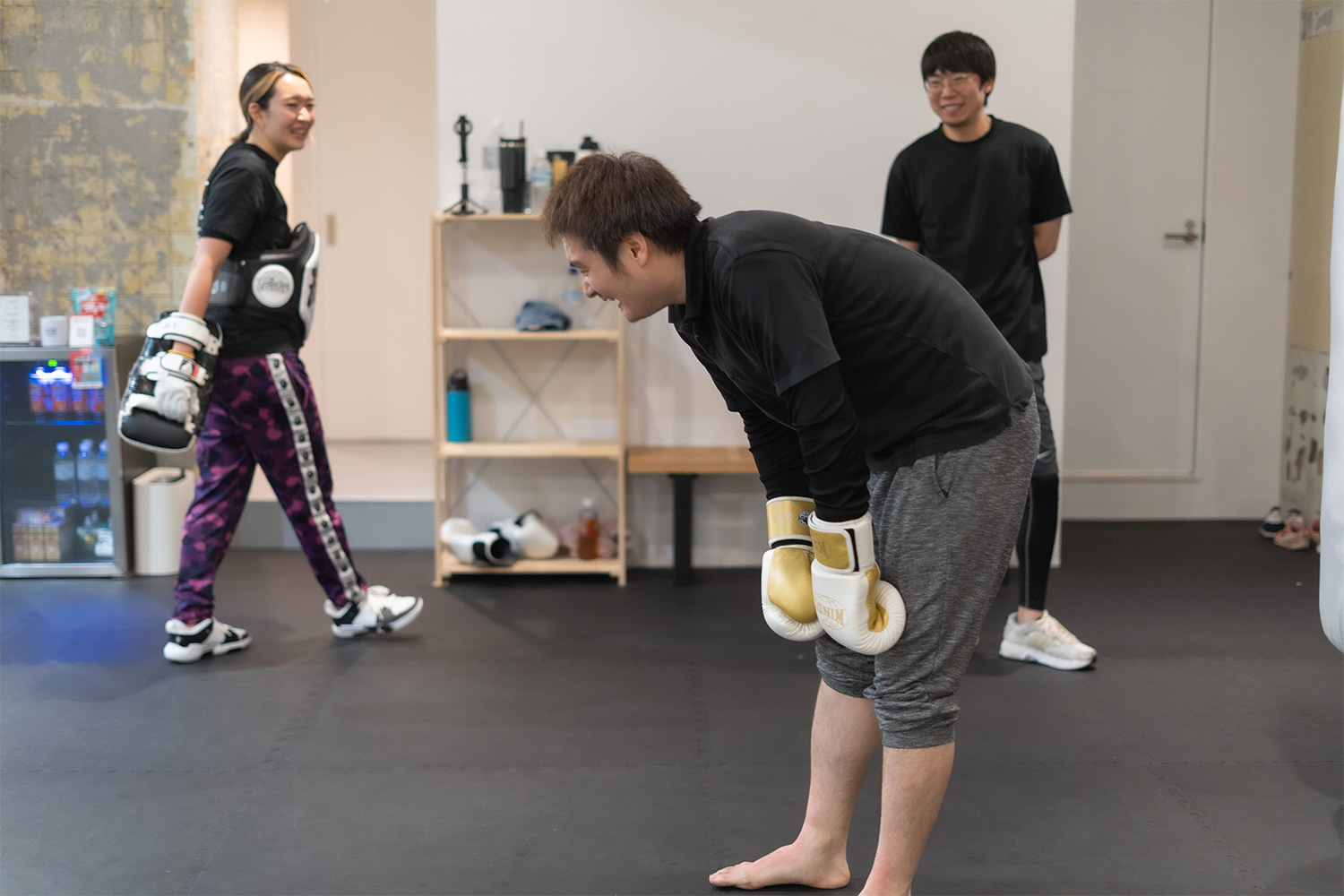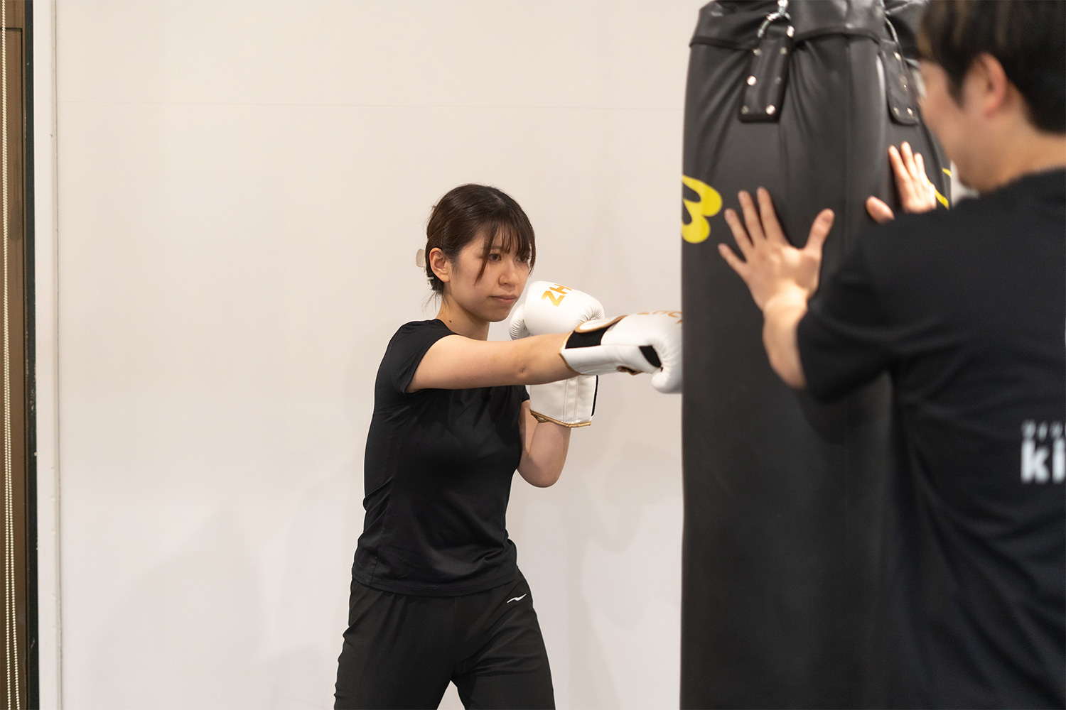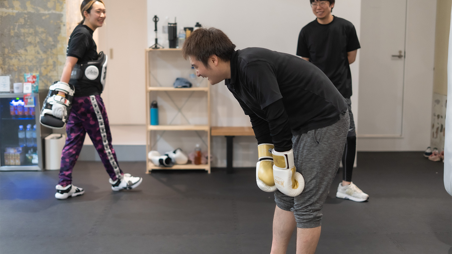 身体をほぐすエクササイズから始めて、基本の構えやパンチ・キックのフォームをスタッフが丁寧にサポートするので、運動が久しぶりの方でも安心して始めていただけます。
