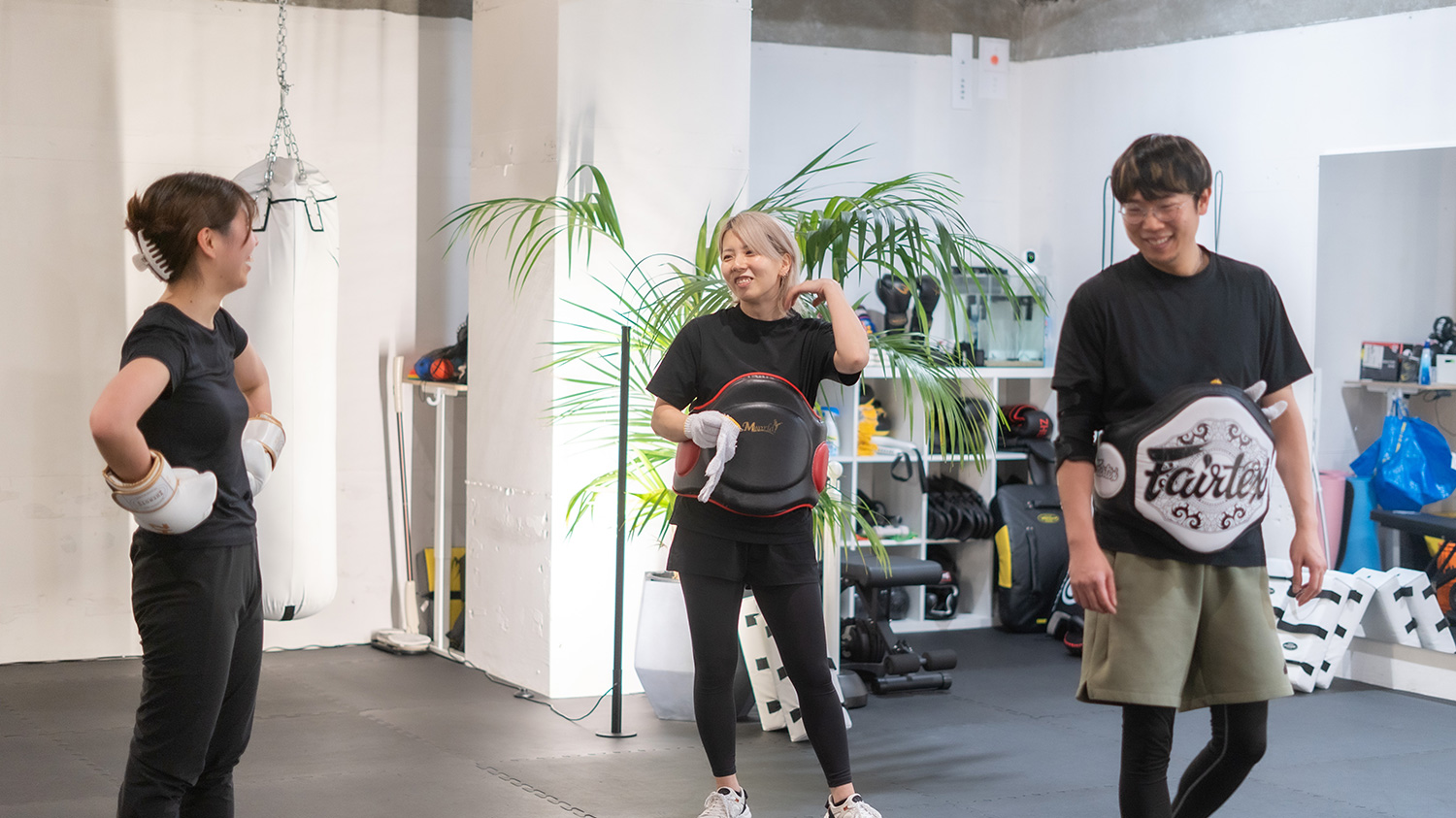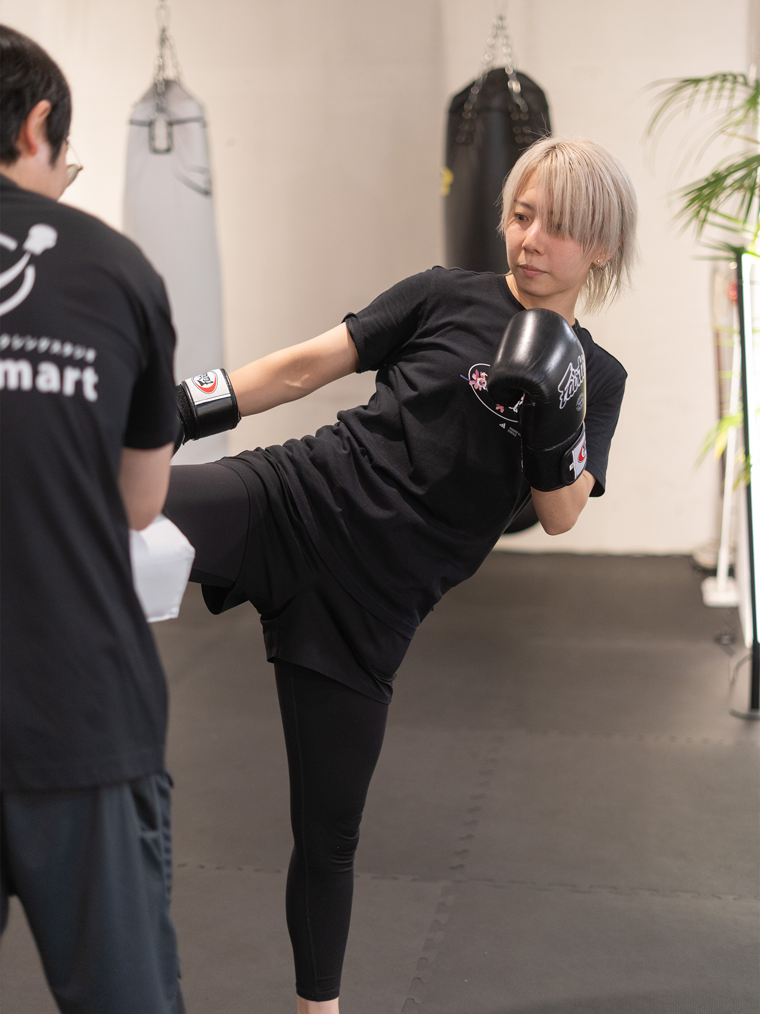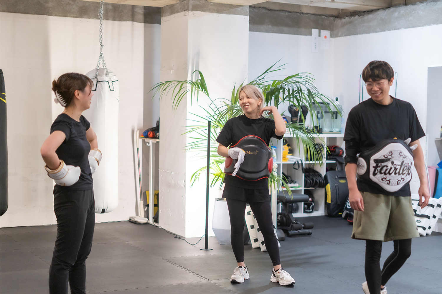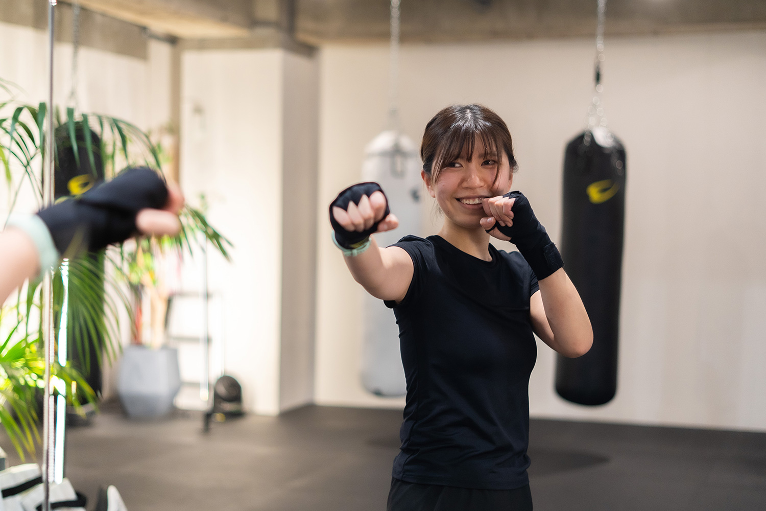 身体をほぐすエクササイズから始めて、基本の構えやパンチ・キックのフォームをスタッフが丁寧にサポートするので、運動が久しぶりの方でも安心して始めていただけます。