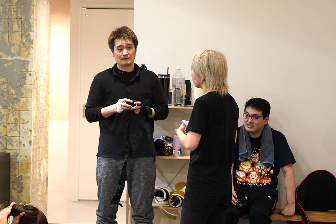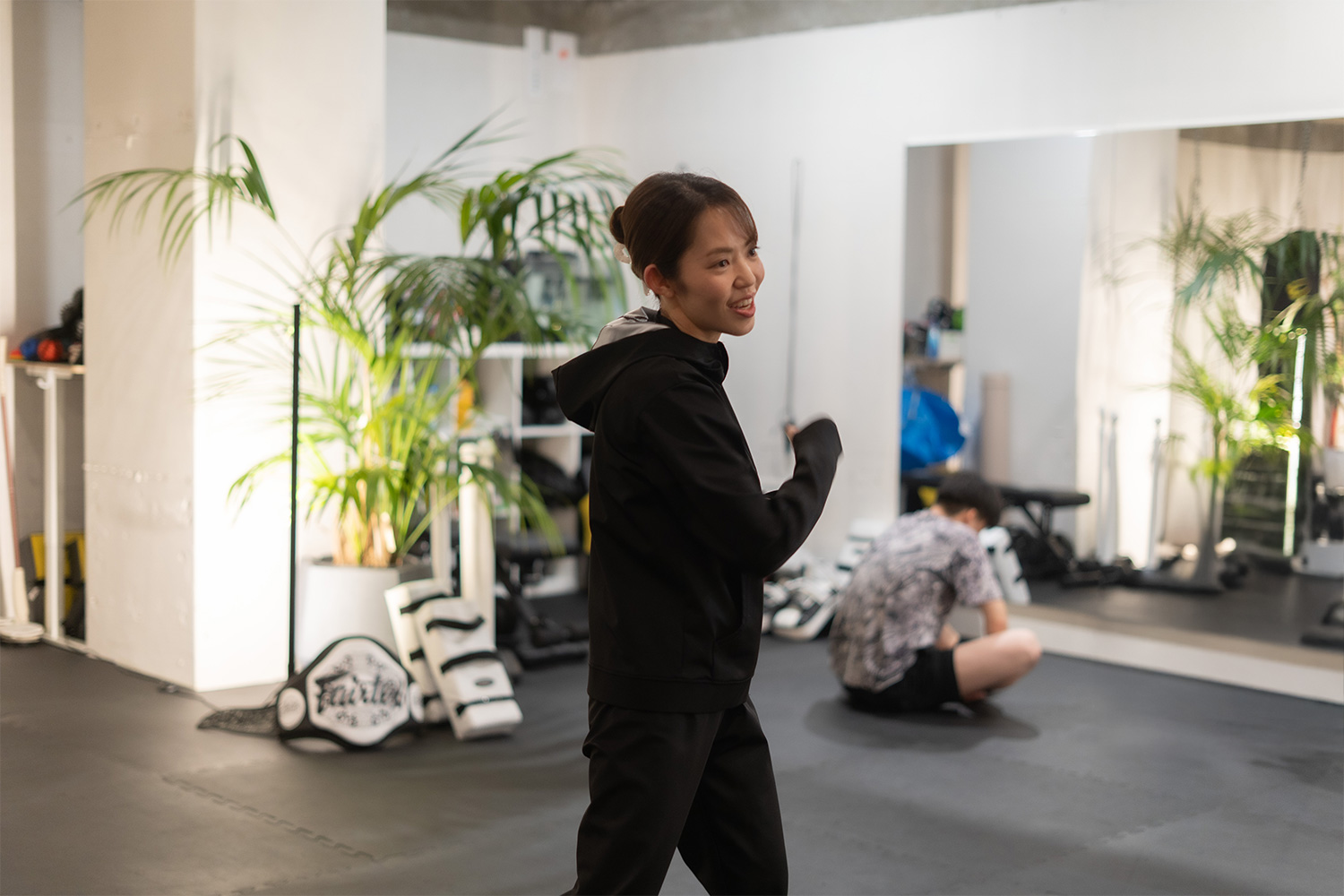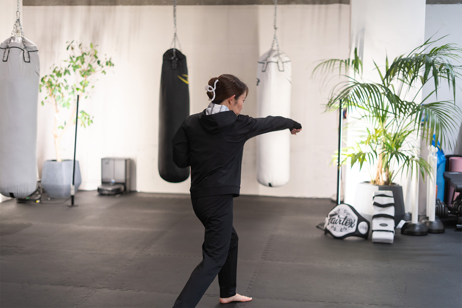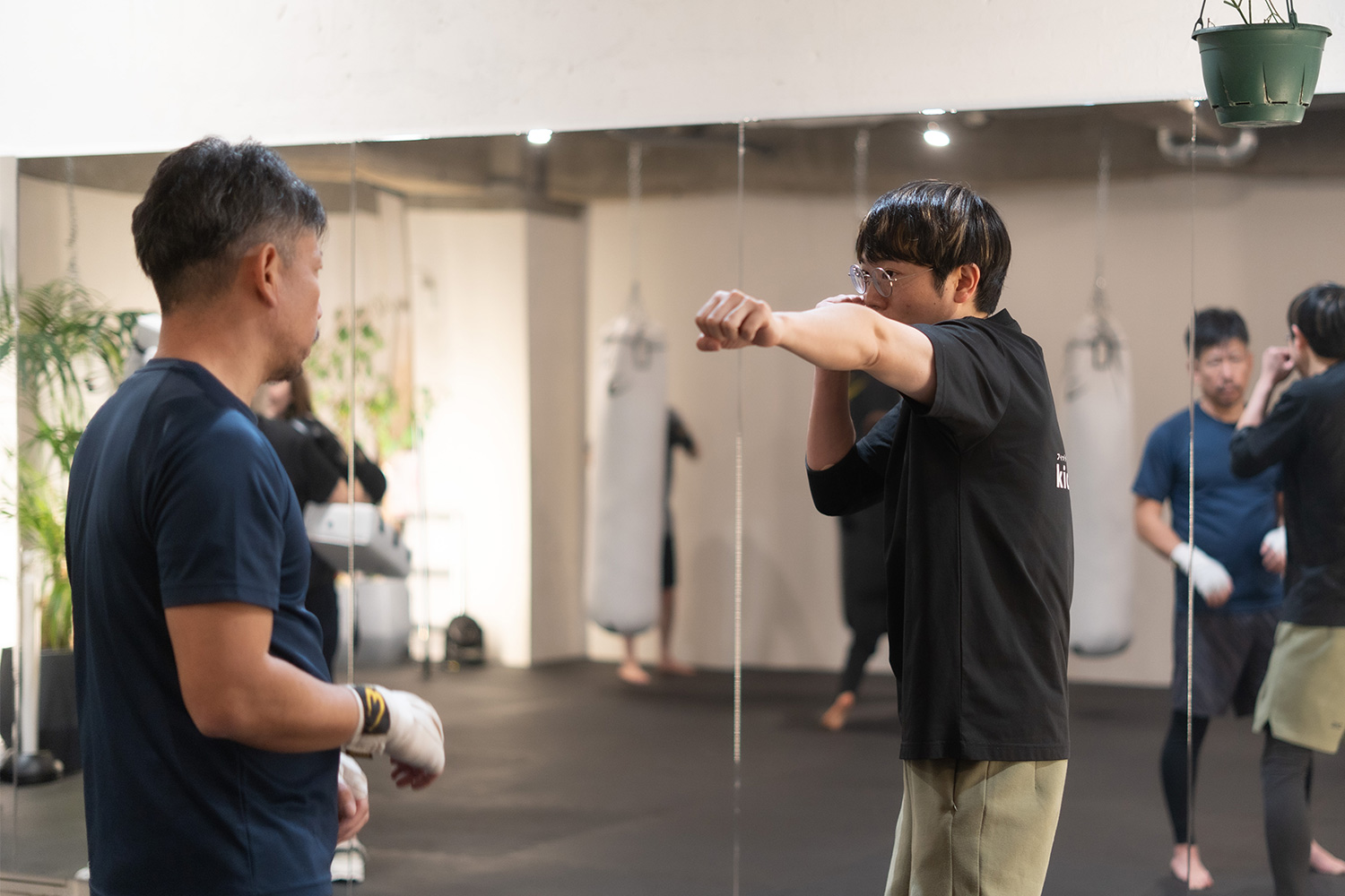 身体をほぐすエクササイズから始めて、基本の構えやパンチ・キックのフォームをスタッフが丁寧にサポートするので、運動が久しぶりの方でも安心して始めていただけます。
